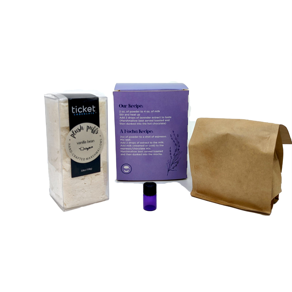 Take home our famous lavender hot chocolate! 8 oz of our hot chocolate mix, 5 jumbo marshmallows and a vial of lavender extract to make this at home. All you need is a blowtorch!